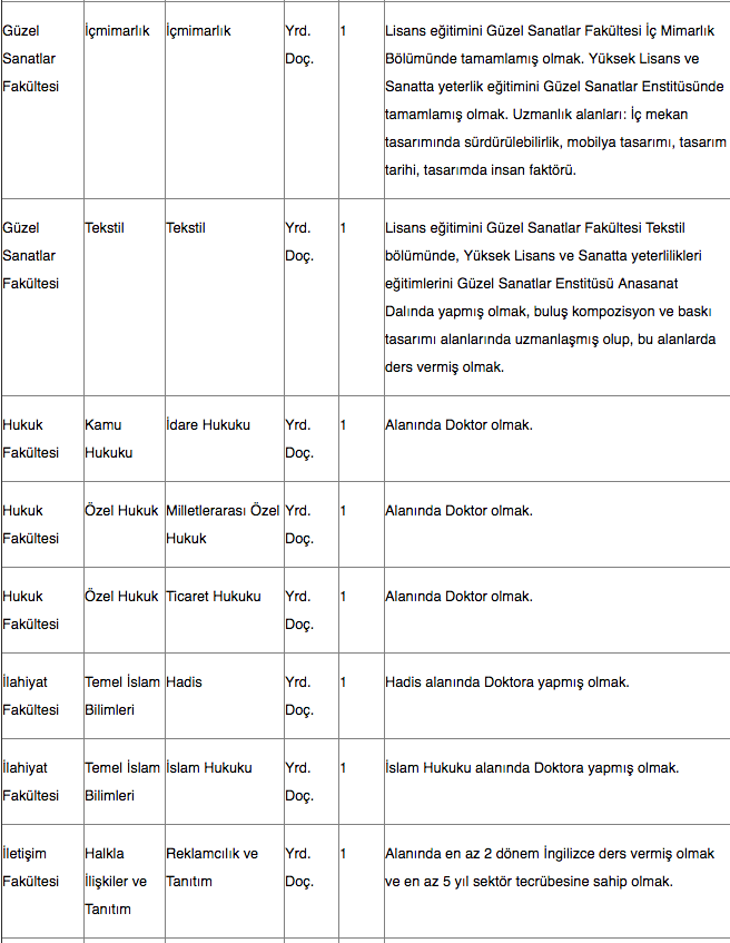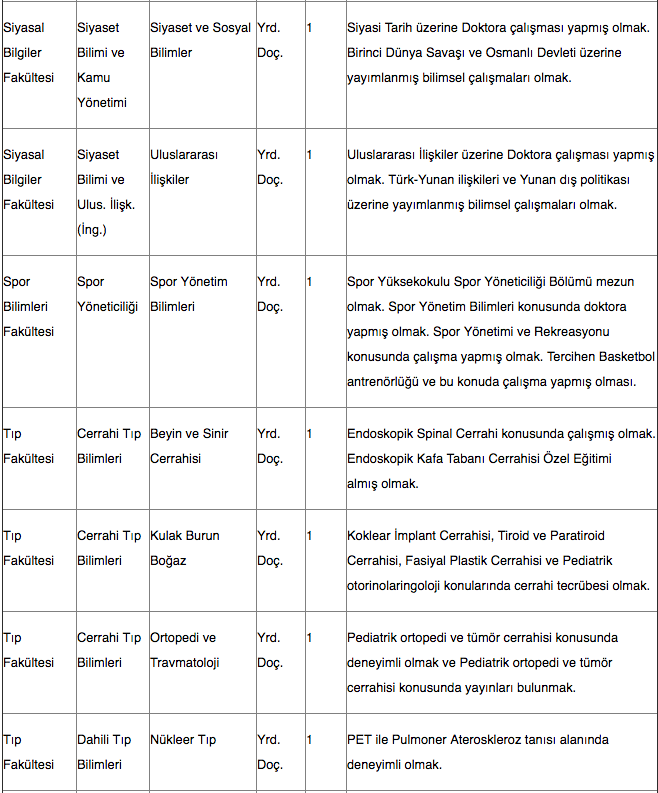 Üniversitemiz Atatürk Eğitim Fakültesi, Diş hekimliği Fakültesi, Eczacılık Fakültesi, Fen-Edebiyat Fakültesi, Güzel Sanatlar Fakültesi, Hukuk Fakültesi, İlahiyat Fakültesi, İletişim Fakültesi, İşletme Fakültesi, Mühendislik Fakültesi,, Siyasal Bilgiler Fakültesi, Spor Bilimleri Fakültesi, Tıp Fakültesi, Bankacılık ve Sigortacılık Yüksekokulu, Sağlık Hizmetleri Meslek Yüksekokulu ve Teknik Bilimler Meslek Yüksekokulu'na aşağıda belirtilen Bölüm ve Anabilim Dalına 2547 sayılı Kanunun ve Öğretim Üyeliğine Yükseltme ve Atanma Yönetmeliğinin ilgili maddeleri uyarınca, Üniversitemiz Öğretim Üyeliğine Yükseltilme ve Atanma Kriterlerini sağlamış olmak koşuluyla Yardımcı Doçent alınacaktır.