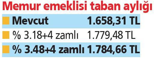 Memur emeklilerinin Temmuz zam oranları da memurlarla aynı olacak. Temmuz zammı eğer yüzde 3.48 + yüzde 4 şeklinde olursa, en düşük memur emeklisi maaşı bin 658 liradan bin 784 liraya yükselecek. En düşük maaşta böylece 126 lira artış yaşanacak. Memur emeklileri ise Temmuz maaşlarını 22-23 Haziran tarihlerinde zamsız olarak alacak, zam farkını ise önümüzdeki ayın içerisinde ceplerine koyacak. Farkların yatırılacağı tarih Sosyal Güvenlik Kurumu tarafından duyurulacak.