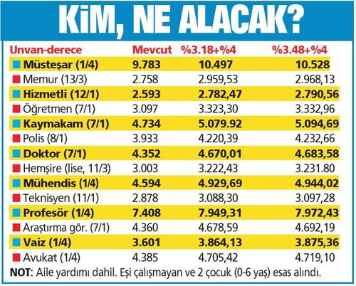 Bu tahmin tutarsa, ilk 6 aylık enflasyon yüzde 6.48 olacak. Maaşlara bu durumda Temmuz'da yüzde 4 zamma ilaveten yüzde 3.48 enflasyon farkı yansıtılacak. Temmuz zammı yüzde 3.48 + yüzde 4 olarak gerçekleşirse maaşlarda 197 lira ile 745 lira arasında artış yaşanacak. 12'nci derecenin 1'inci kademesindeki hizmetli maaşı 2 bin 593 liradan 197 lira artışla 2 bin 790 liraya ulaşacak. 1'inci derecenin 4'üncü kademesindeki müsteşar maaşı ise 9 bin 783 liradan 745 lira artışla 10 bin 528 liraya yükselecek. Memurların Temmuz zammı 3 Temmuz'da belli olacak. Zamlı maaşlar ayın 15'inde ödenecek.