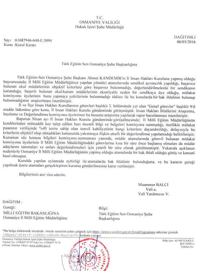 Türk Eğitim Sen Sendikası Osmaniye Şubesince, İl Milli Eğitim Müdürlüğü'nce yapılan yönetici atamalarındasendikal ayrımcılık yapıldığı, başarısız bulunan okul müdürlerinin objektif kriterlere göre değerlendirilmediği, değerlendirmelerde bir sendikanın korunduğu, başarılı bulunan okul müdürlerinin ekseriyetle sadece tek bir sendikaya üye olduğu ve bu nedenlerle hak ihlalinin yapıldığı belirtilerek İl İnsan Hakları Kuruluna başvuruda bulunmuştu.