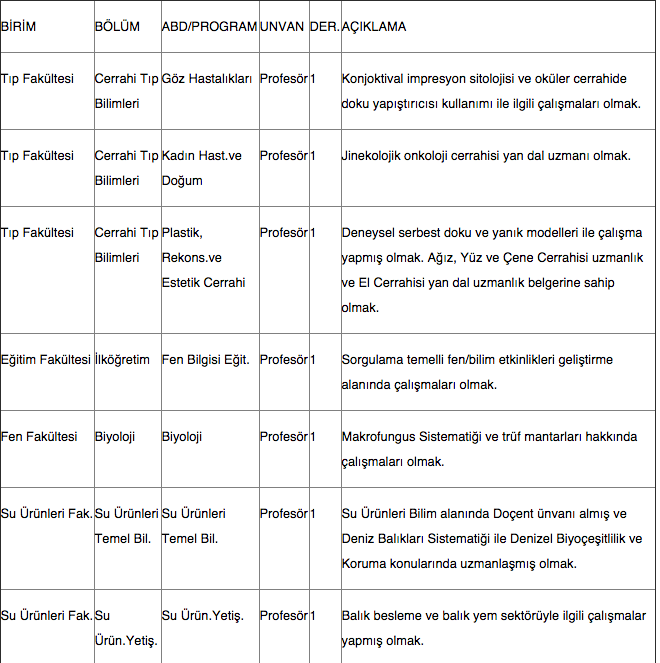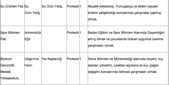 Üniversitemizin aşağıda belirtilen boş kadrolarına 2547 sayılı Kanun, Öğretim Üyeliğine Yükseltilme ve Atanma Yönetmeliği ile Muğla Sıtkı Koçman Üniversitesi Öğretim Üyeliği Kadrolarına Başvurma Atama ve Yükseltilme Yönergesi (bakınız: www.personel.mu.edu.tr) hükümleri doğrultusunda öğretim üyesi alınacaktır.