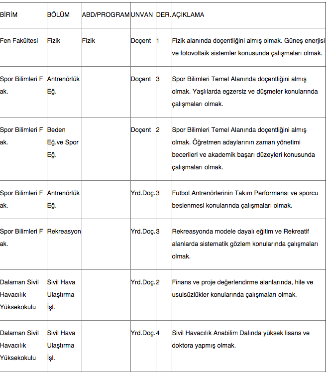 Üniversitemizin aşağıda belirtilen boş kadrolarına 2547 sayılı Kanun, Öğretim Üyeliğine Yükseltilme ve Atanma Yönetmeliği ile Muğla Sıtkı Koçman Üniversitesi Öğretim Üyeliği Kadrolarına Başvurma Atama ve Yükseltilme Yönergesi (bakınız: www.personel.mu.edu.tr) hükümleri doğrultusunda öğretim üyesi alınacaktır.