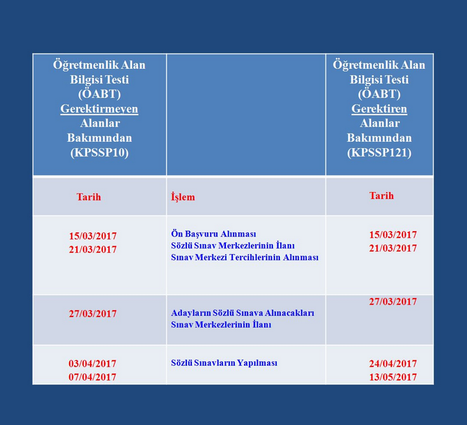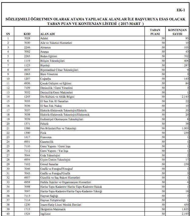 MEB'in 2017 yılı sözleşmeli öğretmen alımı sözlü sınavlarının yapılacağı tarih 3 Nisan 2016 olarak duyuruldu. Sözleşmeli öğretmen kontenjanları da MEB tarafından bir kılavuzla birlikte ilan edildi. MEB’in açıkladığı kontenjan dağılımına göre, 3 bin 570 ile en çok sınıf öğretmenliğine alım yapılacak. Onu 2 bin 193 kontanjanla İngilizce, 2 bin 143 ile din kültürü ve ahlâk bilgisi, 1.835 ile ilköğretim matematik ve 1.720 kişi ile okul öncesi takip ediyor.