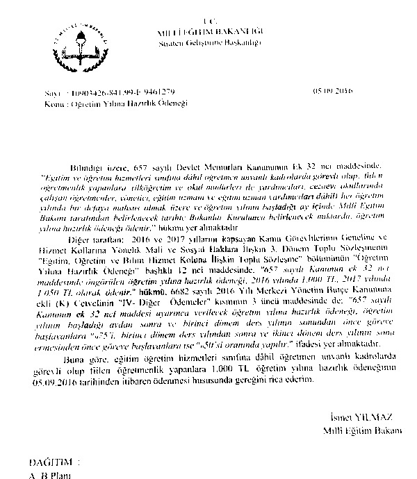 Memurlar adlı sitede yer alan habere göre, Milli Eğitim Bakanlığı, 5 Eylül 2019 tarihi itibarıyla 1000 TL eğitim-öğretime hazırlık ödeneklerinin ödenmesi talimatını 05.09.2016 tarih ve 9461279 sayılı yazısı ile il milli eğitim müdürlüklerine gönderdi.