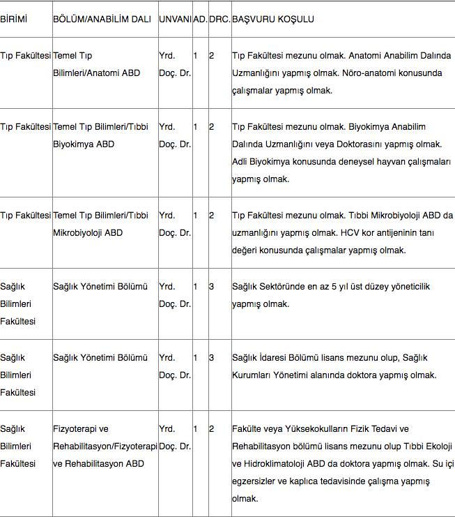 Üniversitemizin aşağıda belirtilen birimlerine, 2547 sayılı Yükseköğretim Kanunu, Öğretim Üyeliğine Yükseltilme ve Atanma Yönetmeliği ve 657 sayılı Devlet Memurları Kanunu'nun 48. maddesinde belirtilen şartları sağlayanlardan Öğretim Üyesi alınacaktır. İlan kadrolarına uygun olmadığı anlaşılan başvurular geçersiz sayılacaktır.
