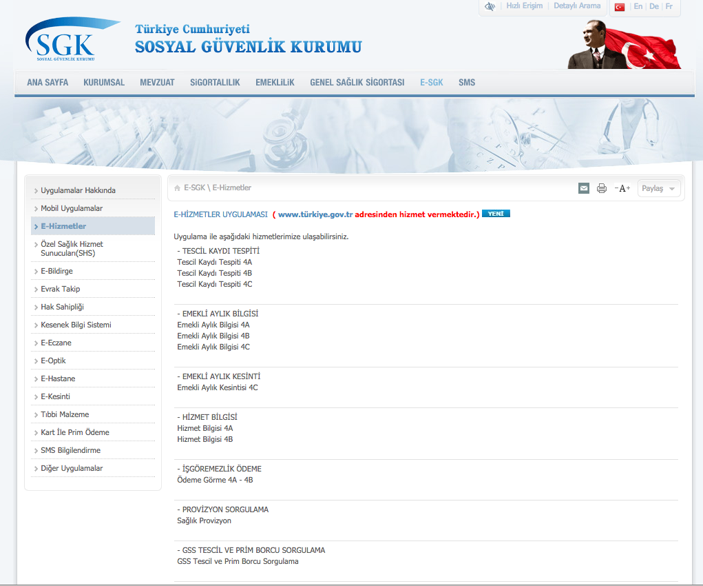 Kişilerin online olarak bilgi alabilmesi ve sigortasını takip edebilmesi amacıyla SGK tarafından özel uygulamalar oluşturulurken, ilgili uygulamalar e devlet üzerinden kullanıma sunulmuştur. E devlet aracılığı ile sunulan hizmetlerden yararlanmak isteyen kişilerin mutlaka üyelik bilgileri ile sisteme erişim sağlaması gerekir. Aksi halde sistem üzerinden herhangi bir sorgulama yapılamaz. Sorgulama biz tr blog sitesindeki SSK sorgulama yazısında belirtildiği gibi SGK menüsü altında yer alan bazı hizmetler resimdeki gibidir