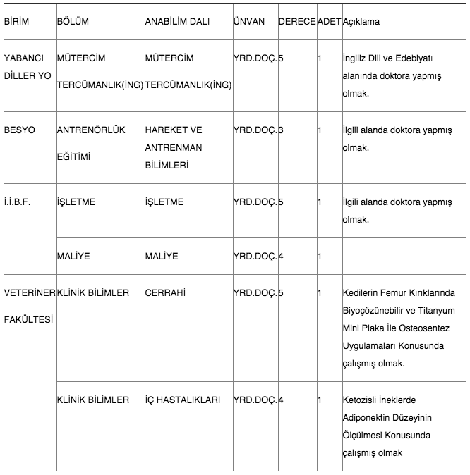 Üniversitemiz birimlerinde açık bulunan ve aşağıda bölümleri/anabilim dallan -programlan ile unvan ve koşullan belirtilen kadrolara 2547 sayılı Kanunun ilgili maddeleri ile 657 sayılı Devlet Memurları Kanunu'nun 48. maddesi, Öğretim Üyeliğine Yükseltilme ve Atanma Yönetmeliği ve Üniversitemiz Öğretim Üyeliğine Yükseltilme ve Atanma Kriterlerine göre öğretim üyeleri alınacaktır.