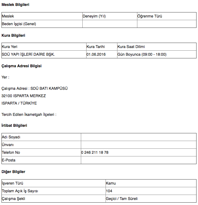 TALEBE BAŞVURACAK ADAYLARIN DİKKATİNE; - Talep şartlarına durumu uyan adaylar, ilanın yayınlandığı tarihten itibaren 10 gün içerisinde talebin yayımlandığı yerdeki İl Müdürlüğümüzden veya www.iskur.gov.tr internet adresi üzerinden başvuru yapabilirler. - Gerçeğe aykırı belge verenlerin ya da beyanda bulunanların başvurusu geçersiz hale getirilmesi, işe alınması işleminin iptaline ilişkin Kurumun ve talep sahibi kamu kurum ve kuruluşunun yasal işlem yapma hakkı saklıdır. Taleplere başvuru yapan ve nihai listede yer alan adaylar, eğitim durumu, tecrübe, öncelik durumu, yabancı dil şartı vb. koşulları taşıyıp taşımadıklarını yazılı veya sözlü sınavdan önce talebi veren kamu kurum ve kuruluşuna ibraz etmek zorundadır. Bu durumlarını belgeleyemeyenler veya yanlış beyanda bulunanlar nihai listeden çıkarılarak sıralamada yer alan diğer kişiler listelere dahil edilecektir. - Merkezi sınav uygulanmayacak kişilerden (önceliklilerden) müracaat eden adaylar içerisinden öncelik belge tarihlerine göre talep sayısının üç katını geçmeyecek şekilde isim ve adresleri ile durumlarını açıklayıcı bilgi talep sahibi kamu kurum ve kuruluşuna bildirilecektir. - Son müracaat tarihi resmi tatile rastladığında bir sonraki iş günü başvurular kabul edilecektir. - Müracaat tarihleri çakışan, aynı kamu kurum ve kuruluşunun birden fazla işgücü talebine durumu uyan iş arayanın, tercihi doğrultusunda sadece bir talebe müracaatı kabul edilecektir. - Merkezi sınav kapsamında müracaat eden adaylar içerisinden en yüksek puan alandan başlamak üzere talep sayısının üç katı olacak şekilde düzenlenecek nihai listede yer alan kişilerin isim ve adresleri, işçi talebinde bulunan kamu kurum ve kuruluşuna bildirilecektir. - İşyerine ismi bildirilen kişilere yazılı veya sözlü sınavın yeri ve zamanı talebi veren kamu kurum ve kuruluşu tarafından adaylara yazılı olarak bildirilecektir. - Öncelik hakkına sahip olanlardan, başvuruda bulundukları sürekli işgücü talebine işverence davet edildikleri halde mücbir sebepler dışında icabet etmeyen, sınava katılmayan, işi reddeden veya kamuda sürekli işçi statüsünde işe yerleşenlerin öncelik hakkı ortadan kalkar. Öncelik hakkından ikinci kez yararlanılamaz. Çalışma süresi 90 gün ,işe başlama tarihi 01.07.2016 olup SDÜ yapı işleri daire başkanlığında 01.06.2016 saat 09:00 da noter huzurunda kura çekimi yapılacaktır.Sözlü mülakat 14.06.2016 ve 15. 06.2016 tarihlerinde saat 09:00 da yapılacaktır. iletişim tel: 0 246 211 18 78.