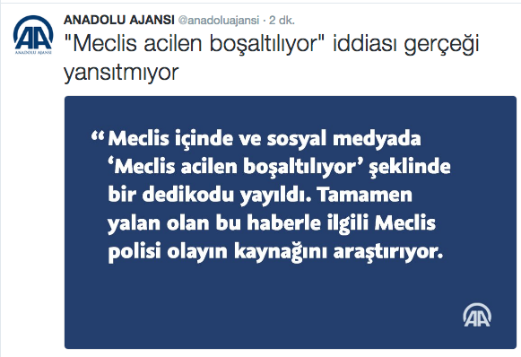Anadolu Ajansı ise Twitter'dan konuyla ilgili, binanın boşaltılmadığını sosyal medyada yayılan bir dedikodu olduğu bilgisini geçti. Polisin bu iddiayı araştırdığını servis etti.