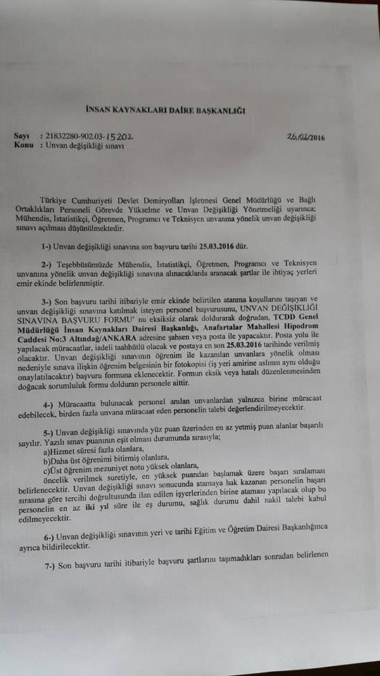 Sınava son başvuru 25 Mart 2016. Sınava başvuruda bulunmak isteyenlerin Unvan Değişikliği Sınavına Başvuru Formunu eksiksiz bir şekilde doldurarak TCDD Genel Müdürlüğü İnsan Kaynakları Dairesi Başkanlığı'na göndermeleri gerekiyor.