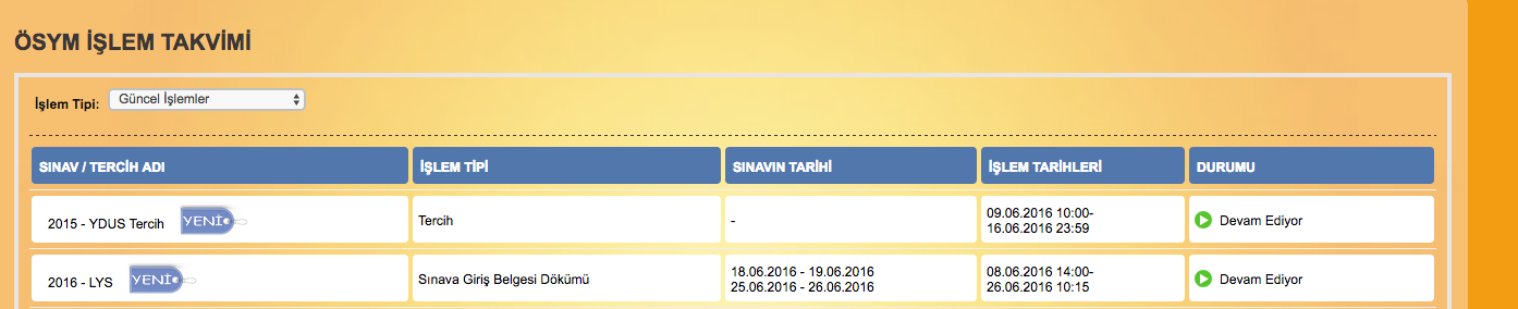 2015-YDUS (dava süreci sona eren alanlar) ile ilgili tercih işlemleri,9-16 Haziran 2016 tarihleri arasında ÖSYM'nin http://www.osym.gov.tr internet adresinden aday tarafından, bireysel olarak internet aracılığıyla yapılacaktır. Yerleştirme, 2015-YDUS Başvuru Kılavuzunda yer alan ilke ve kurallara göre yapılacaktır.