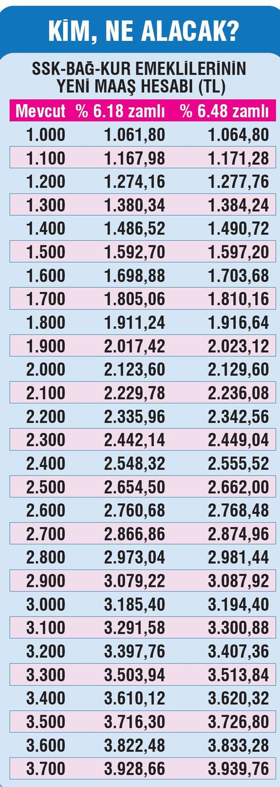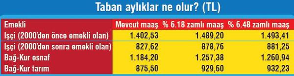Eğer zam oranı yüzde 6.48 olarak gerçekleşirse, en düşük maaş 2000'den önce emekli olan SSK'lılarda bin 402 liradan bin 493 liraya, 2000'den sonra emekli olan SSK'lılarda ise 827,62 liradan 881,25 liraya yükselecek. Taban maaş; Bağ-Kur esnaf emeklilerinde bin 184 liradan bin 260 liraya, Bağ- Kur tarım emeklilerinde 875,50 liradan 932,23 liraya çıkacak. Temmuz zammı yüzde 6.48 olarak gerçekleşirse, halen bin 500 lira olan maaş bin 597 lira 20 kuruşa ulaşacak. 2 bin lira olan maaş 2 bin 129 liraya, 2 bin 500 lira olan maaş da 2 bin 662 liraya yükselecek..