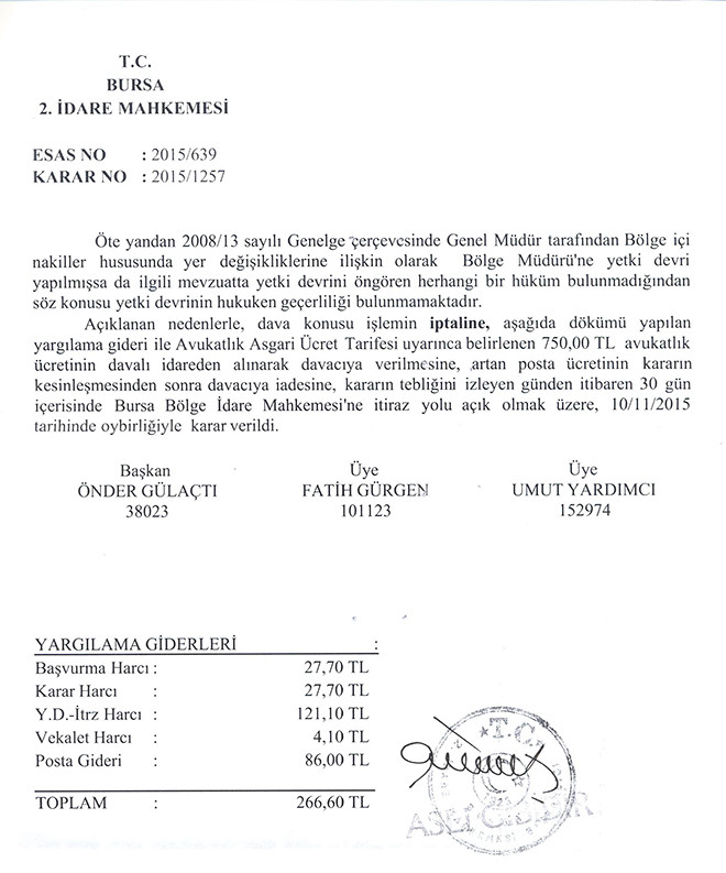 Açılan davada, idare mahkemesi, bölge müdürünün böyle bir nakil işlemini yapma yetkisine haiz olmadığına karar vererek işlemin iptaline karar verdi.