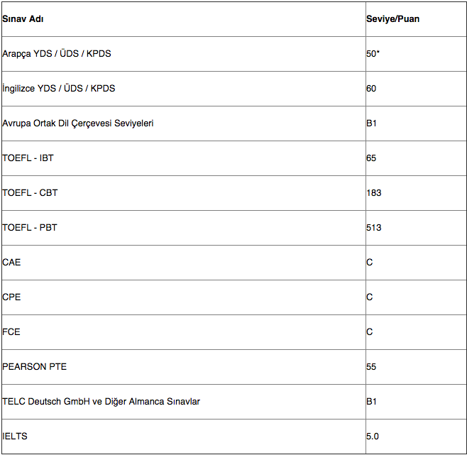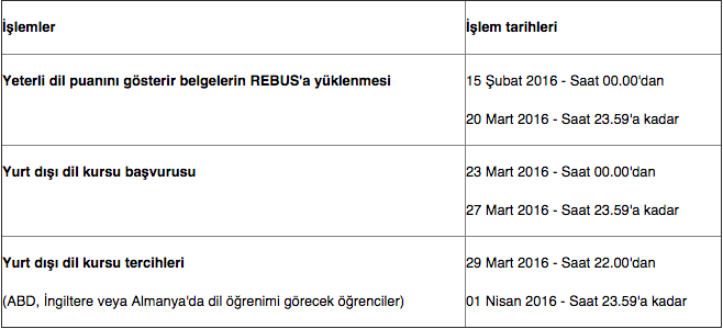 Yurt dışı dil ve başvuru işlemlerine katılacak öğrencilerinden Almanca, Arapça ve İngilizce için yeterli dil puanına (Bkz. 2015 öğrencileri için Tablo 1, 2014 öğrencileri için Tablo 2) sahip olanların, yabancı dil sınavı sonuç belgelerini işlem takviminde belirtilen tarihler arasında REBUS'a yüklemeleri zorunludur. Yeterli yabancı dil puanlarını ibraz etmeyen öğrencilerin başvuru ve tercih işlemleri iptal edilecektir.