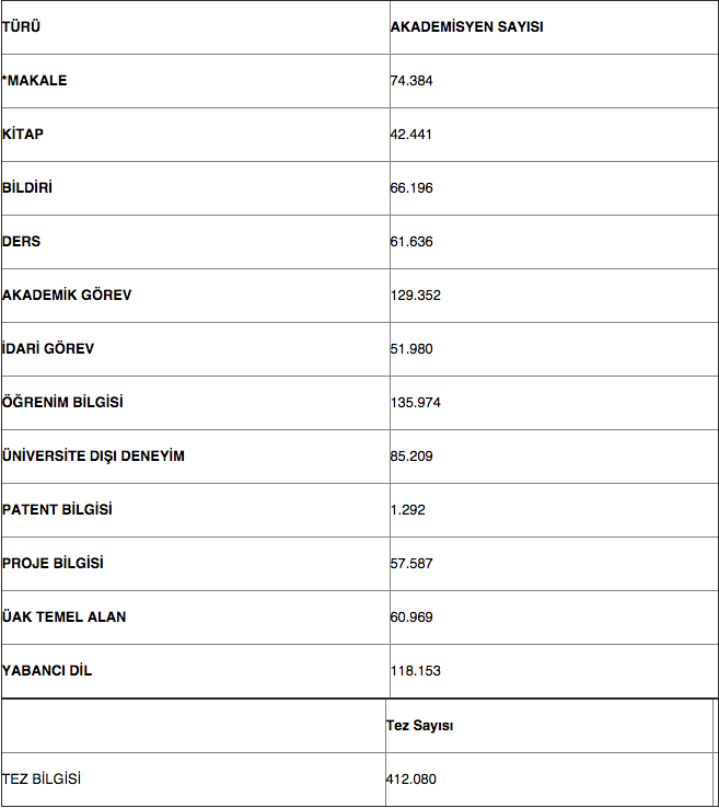 Sisteme, akademisyenlerden 74 bin 384'ü makale, 42 bin 441'i kitap, 66 bin 196'sı bildiri, 61 bin 636'sı ders, 129 bin 352'si akademik görev, 51 bin 980'i idari görev, 135 bin 974'ü öğrenim bilgisi, 85 bin 209'u üniversite dışı deneyim, bin 292'si patent bilgisi, 57 bin 587'si proje bilgisi, 60 bin 969'u Üniversiteler Arası Kurul temel alan verisi, 118 bin 153'ü yabancı dil bilgisi, 412 bin 804'ü de tez bilgisi girişi yaptı.